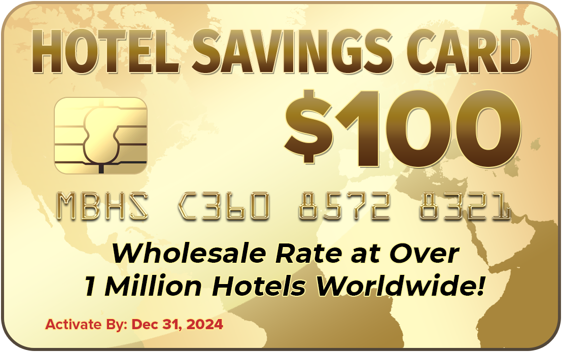Our hotel savings card has no activation fees and never expire. These credits are accepted at over 1 million hotels worldwide, over 8,000 car rentals, and many excursions and events.